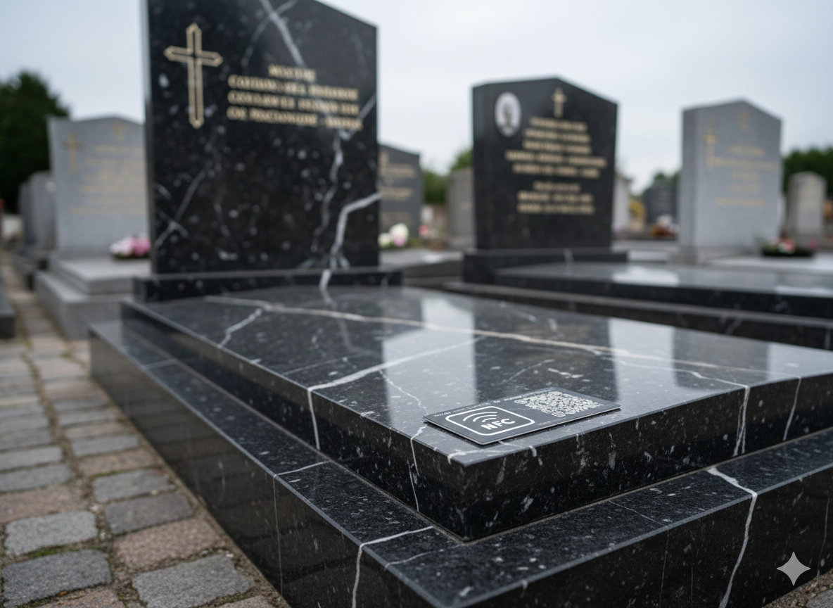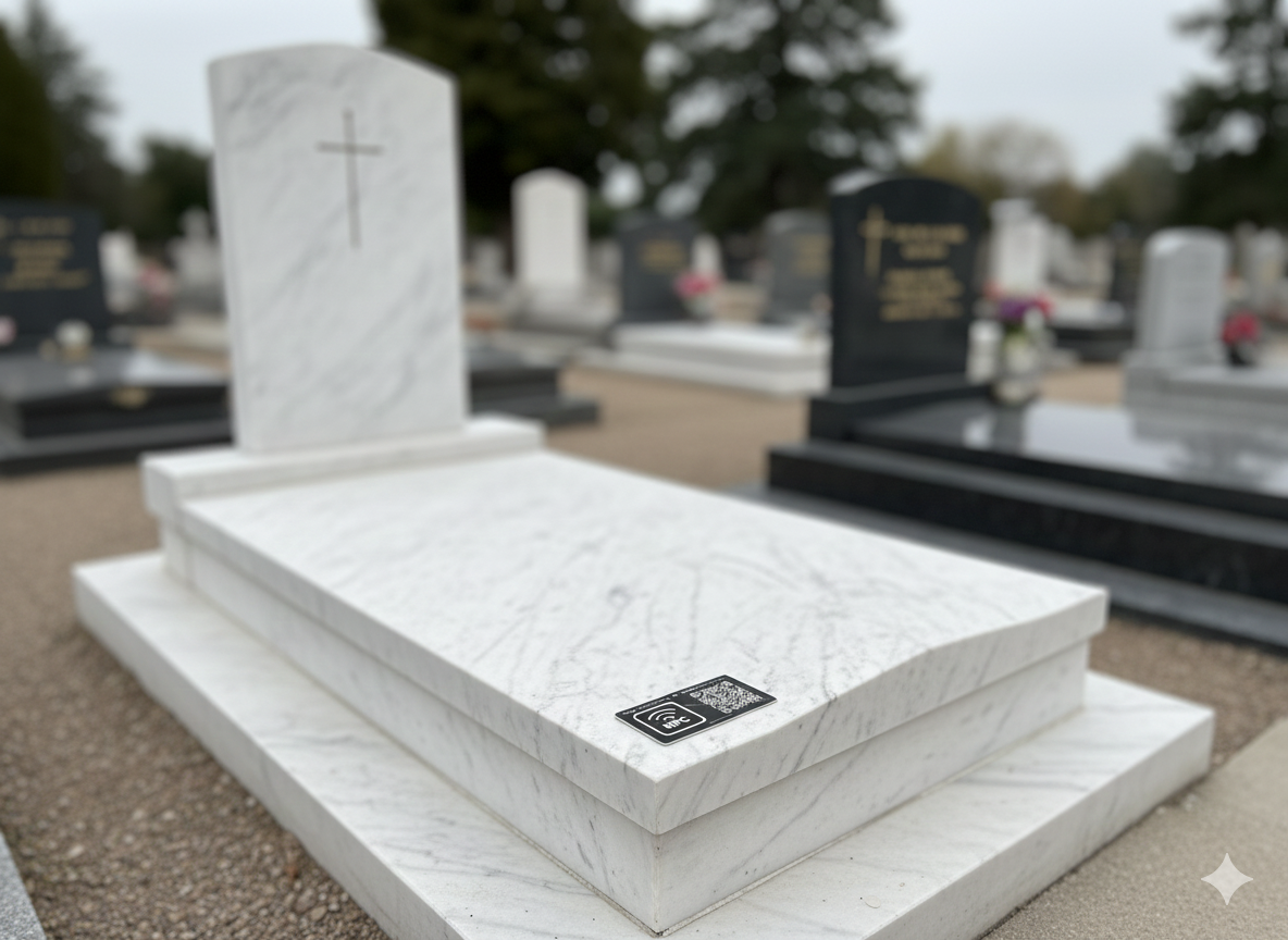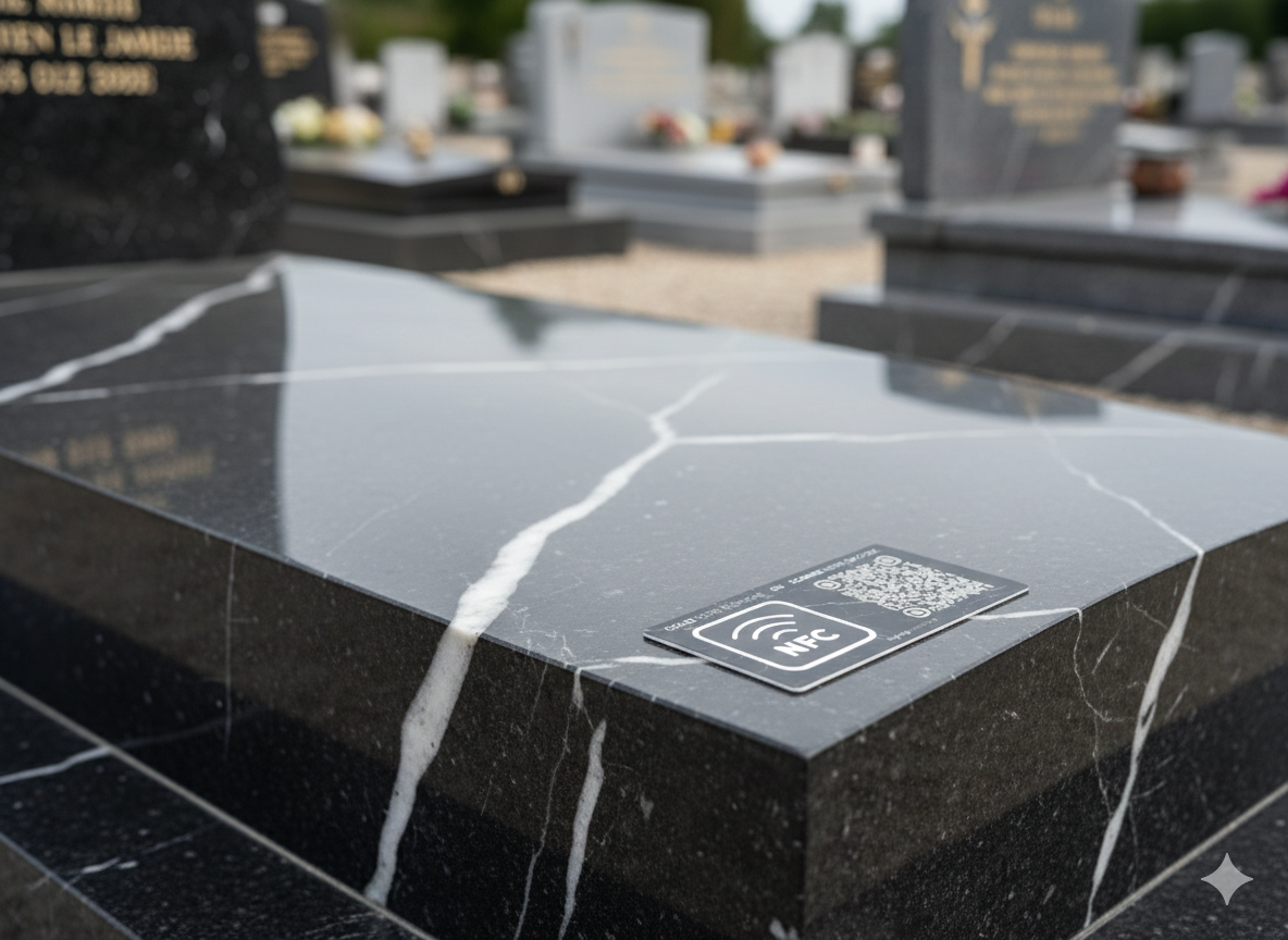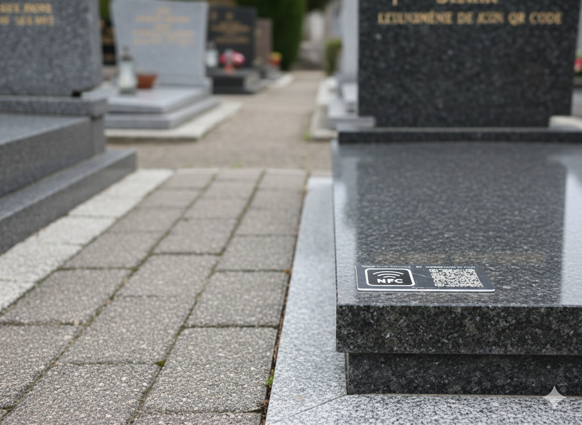 La plaque reste sobre et discrète au cimetière. Une puce NFC et un QR code intégrés permettent d’ouvrir, avec un smartphone, un mémorial numérique personnalisé.